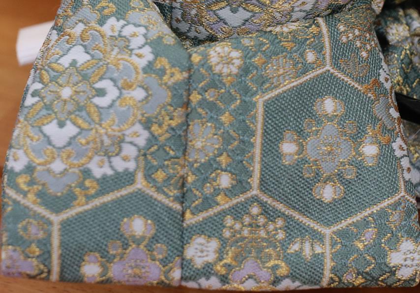 文様は、綿で木瓜(もっこう)形を表し、草花文様で縞に区切られた構成です。全体的に綿で文様が表現されているのは、鎖繍(くさりぬい)刺繍のペルシャ裂を参考に織り出しているためです。木瓜形の中に配された花文様や、特徴と駅な葉文様の趣が、西域の風情を感じさせる華麗な印象の裂で慶賀の時を寿ぎます。