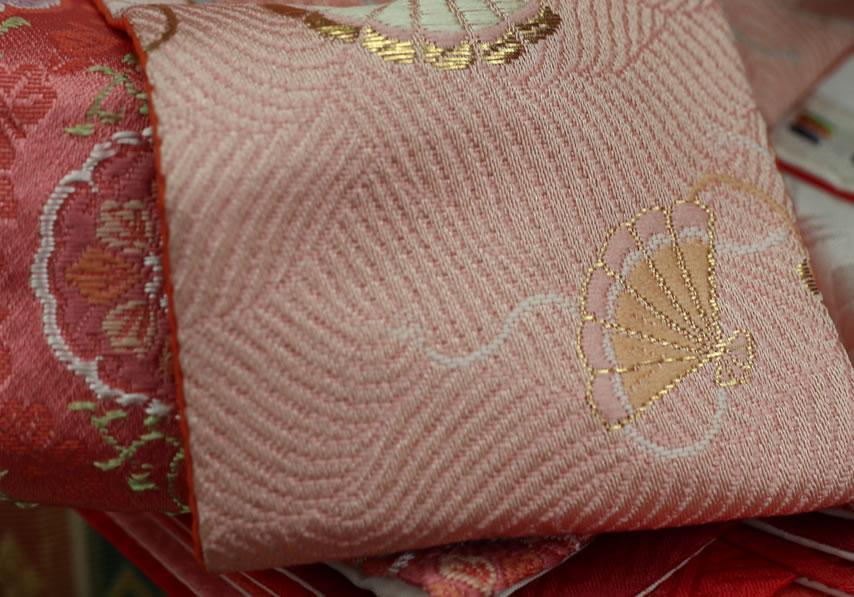 日本へは仏教と共に伝来しました。扇は高温多湿の日本の風土から生まれました。末広がりの形状が繁栄の象徴として縁起の良いものとされています。扇面には吉祥文様があしらわれています。美しく、おめでたい意匠の金襴です。