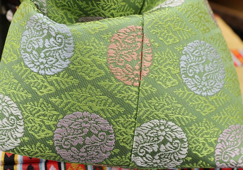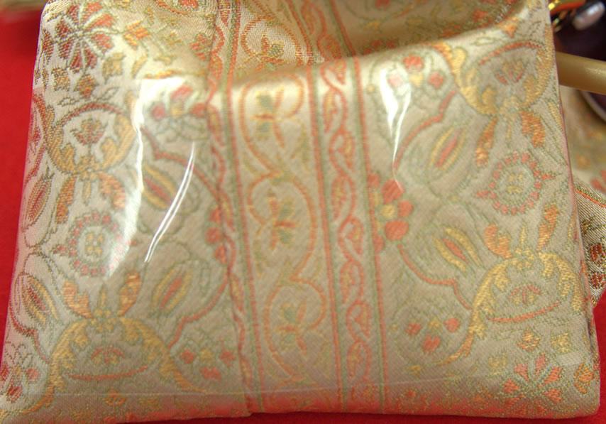 文様は、綿で木瓜(もっこう)形を表し、草花文様で縞に区切られた構成です。全体的に綿で文様が表現されているのは、鎖繍(くさりぬい)刺繍のペルシャ裂を参考に織り出しているためです。木瓜形の中に配された花文様や、特徴と駅な葉文様の趣が、西域の風情を感じさせる華麗な印象の裂で慶賀の時を寿ぎます。