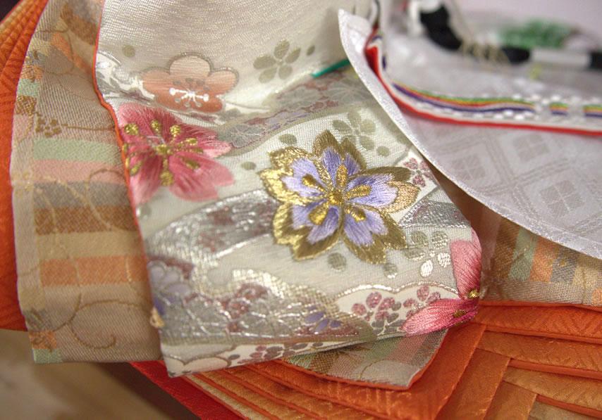 姫は打梨(うちなし)と呼ぶ柔らかな薄地の重ネを使い(薄い和紙を羽二重に張り、仕上げのときにはがす等)柔装束(なえしょうぞく)風に仕上げました。