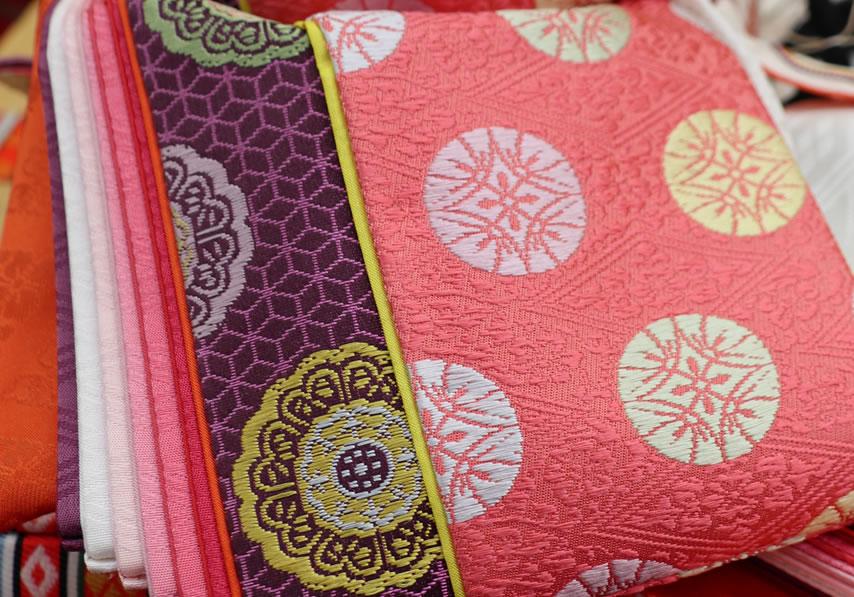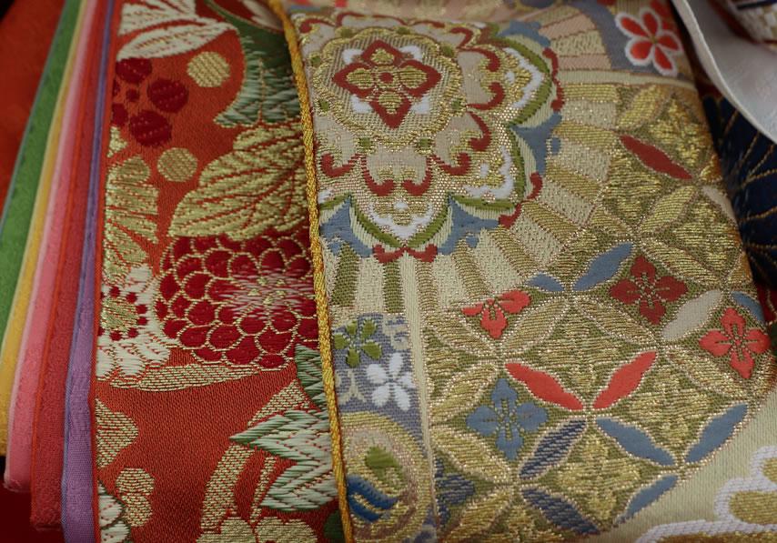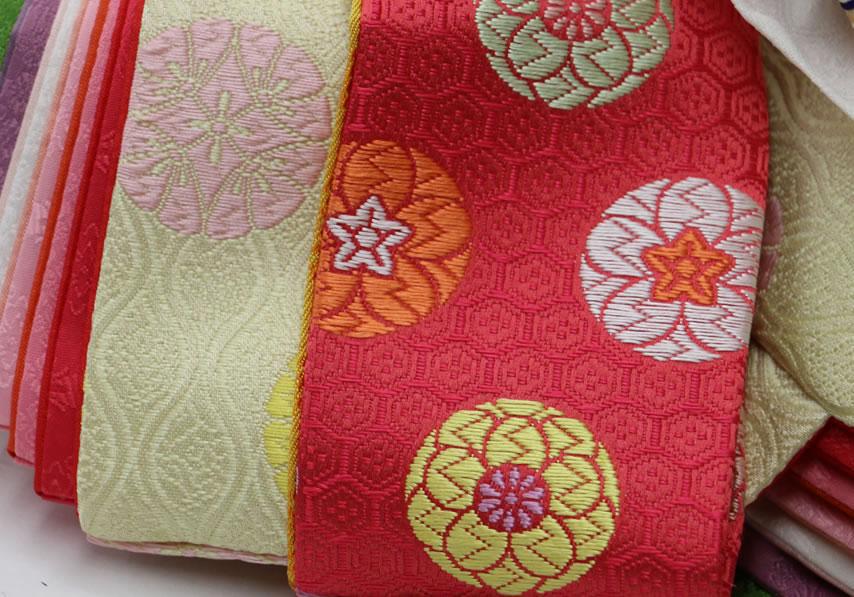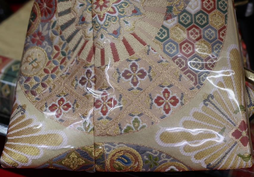 日本へは仏教と共に伝来しました。扇は高温多湿の日本の風土から生まれました。末広がりの形状が繁栄の象徴として縁起の良いものとされています。扇面には吉祥文様があしらわれています。美しく、おめでたい意匠の金襴です。