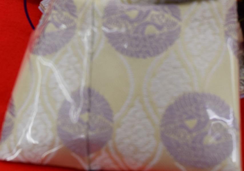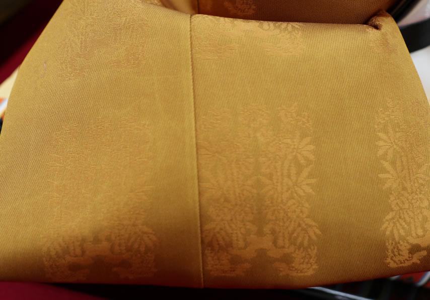 文様は桐竹鳳凰で、これは中国の太古に黄帝が南園に斎をしていた時、庭上の桐樹に鳳凰が竹の実をくわえてとまったという故事により作られたものです。黄帝は聖天子とされ、鳳凰は聖人の位にあり、天下泰平の時に出る瑞鳥といわれたことから、天皇の御服の文様とされました。現在も天皇御即位式等にお召しになられる由緒ある文様です。