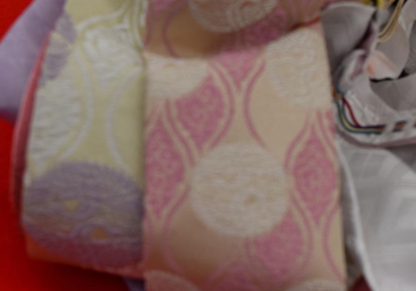 菱形に丸文様で構成されています。菱は池沼に生える水草、菱の実をもとにした植物文様のひとつです。多弁菱形の花菱に蔓を添えた意匠です。丸文には宝相華を四つの扇が囲むようにデザインされています。宝相華は楽園に咲く空想の花です。さまざまな花の美しい部分を組み合わせ、中国唐代に作り出されました。